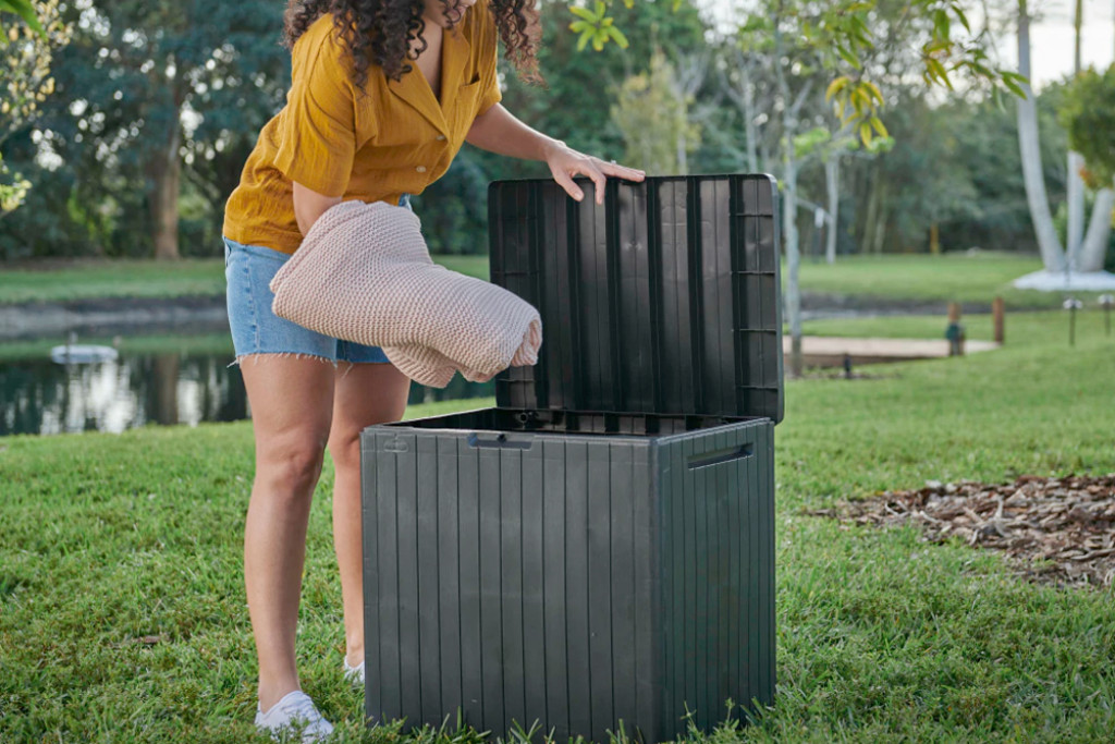 Brinquedos? Dentro. Almofadas extras? Dentro. Toalhas de piscina? Dentro. E quando você fecha a tampa… tudo volta a parecer organizado.
