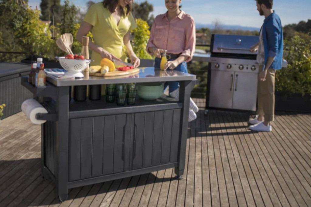 Verão e fim de ano combinam com churrasco, boas conversas e aquele vaivém constante da área gourmet. É nessa hora que brilha a Bancada Buffet XL da Keter. Direto da Itália, ela é como um mini “estação de chef” ao ar livre, com: