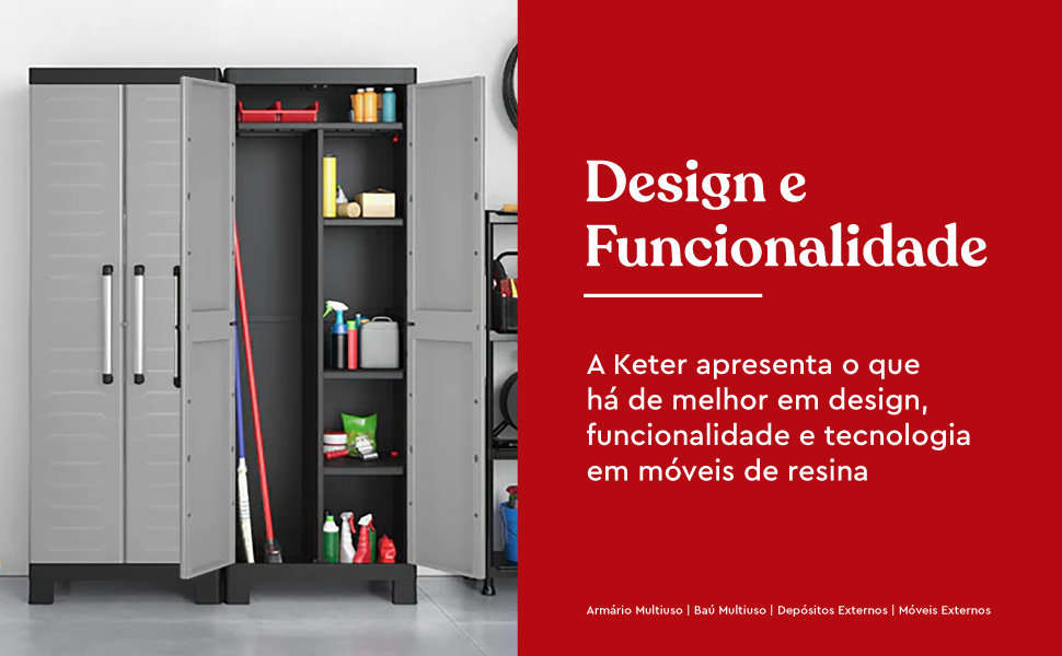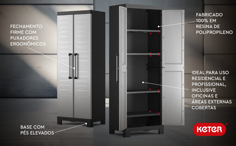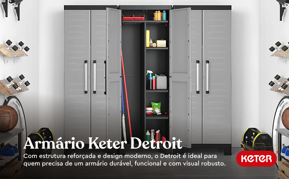 Sua melhor solução de armazenamento de garagem, está aqui! O Detroit gabinete alto tem quatro prateleiras ajustáveis com capacidade para 15 kg cada e sua grade para caixas Tribac permite que você planeje sua solução de armazenamento utilitário interno de maneira inteligente, para acesso fácil e eficiente quando você precisar. As portas com fechadura do armário, estilo DIY, fornecem segurança adicional. Ideal para quem procura um sistema de armazenamento altamente organizado, eficiente e com um design robusto e estiloso. Disponível na cor preta ele combina com áreas de garagem, oficina, atelier e locais de trabalho que necessitam de organização.Fabricado com resina de polipropileno, o Detroit tem garantia Keter, contra defeitos de fabricação, que lhe proporciona segurança na compra, pois estará levando um item de qualidade assegurada.