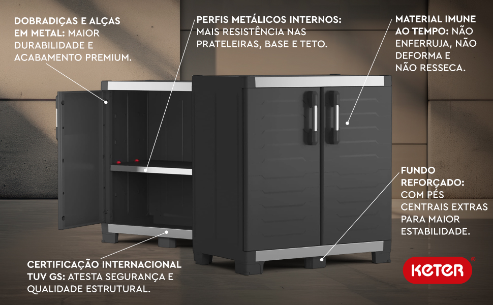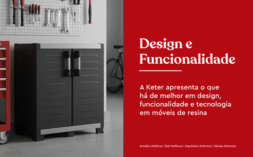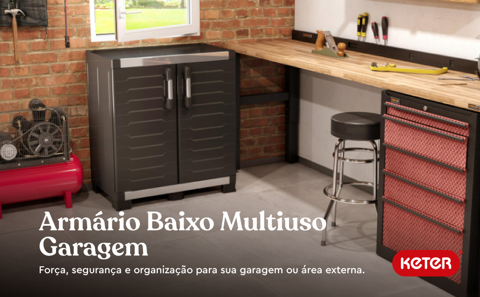 Pensou em armários multiuso, pensou Keter. A melhor marca do mercado no segmento de organização e armazenagem, leva até você o Armário Jolly modelo balcão (baixo) para você organizar seus utencilios de lavanderia, trabalho, ferramentas de jardim. Com este armário multiuso, você obtém todo o espaço de armazenamento interno de que precisa, empilhado de forma inteligente para atender às suas necessidades individuais. O armário tem uma prateleira ajustável com capacidade de carga de 15 kg e portas com fechadura. Disponível em duas opções de cores, preto/cinza grafite e cinza claro.