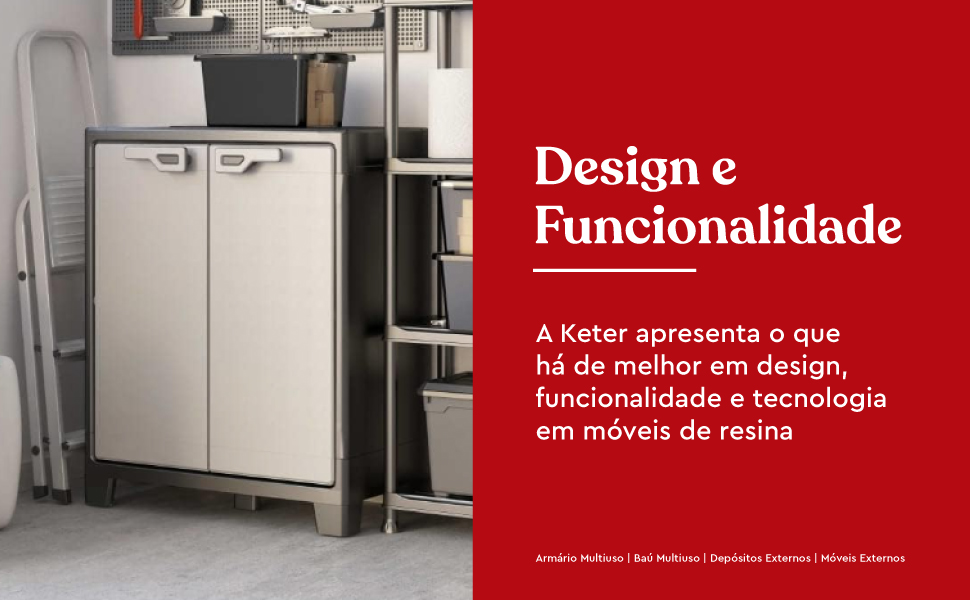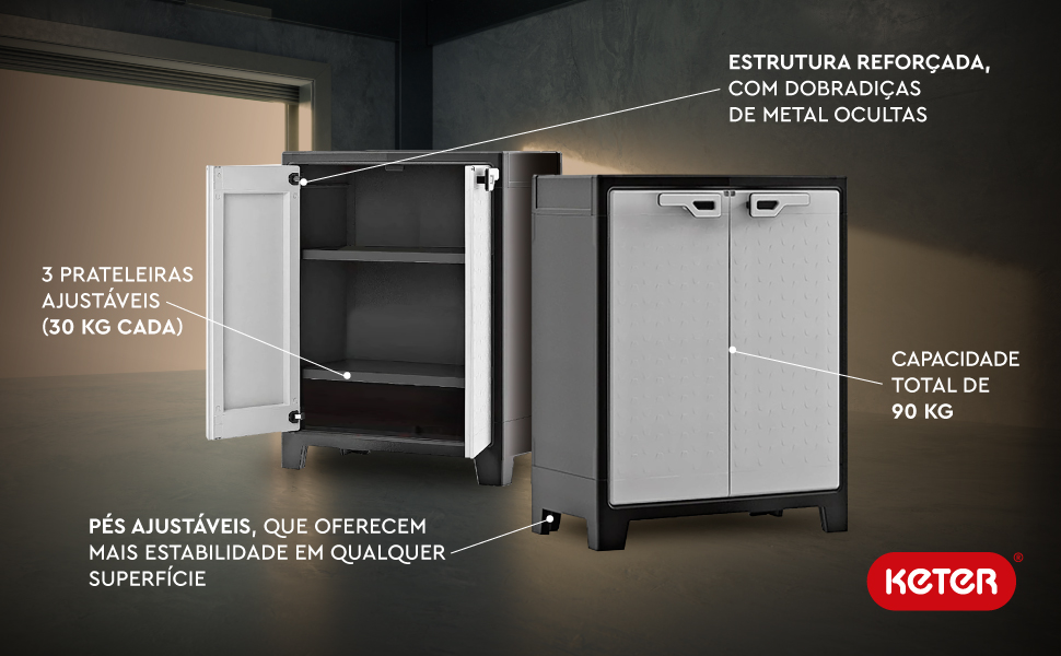 O armário baixo da linha Titan Keter é a prova de que a garagem e o armazenamento ao ar livre também podem ter um lado elegante. Por trás das linhas simples e boa aparência, você encontrará um armário com capacidade total de carga para até 90 Kg, dispostas em prateleiras ajustáveis que apresentam barras de suporte para melhor sustentação e armazenamento . Uma base reforçada com pés ajustáveis adiciona estabilidade ao produto. Portas com chave significam armazenamento sem preocupações. Possui 3 prateleitas com capacidade de 30kg cada uma, perfeitas para guardar brinquedos de piscina, decoração de pátios, equipamentos de jardinagem ou equipamentos esportivos . O Titan é um armário feito para áreas externas, graças ao seu design à prova d'água que inclui dobradiças de metal cobertas e ocultas. Dimensões aproximadas de 100cm de altura, 80 cm de largura e 45 cm de profundidade. Para quem procura alta capacidade de armazenamento, esta é a linha de armários ideal.0 Altura: 100 (cm) Dados do produto SKU: 9762000 Informações Importantes