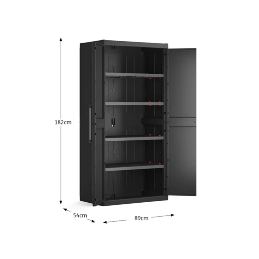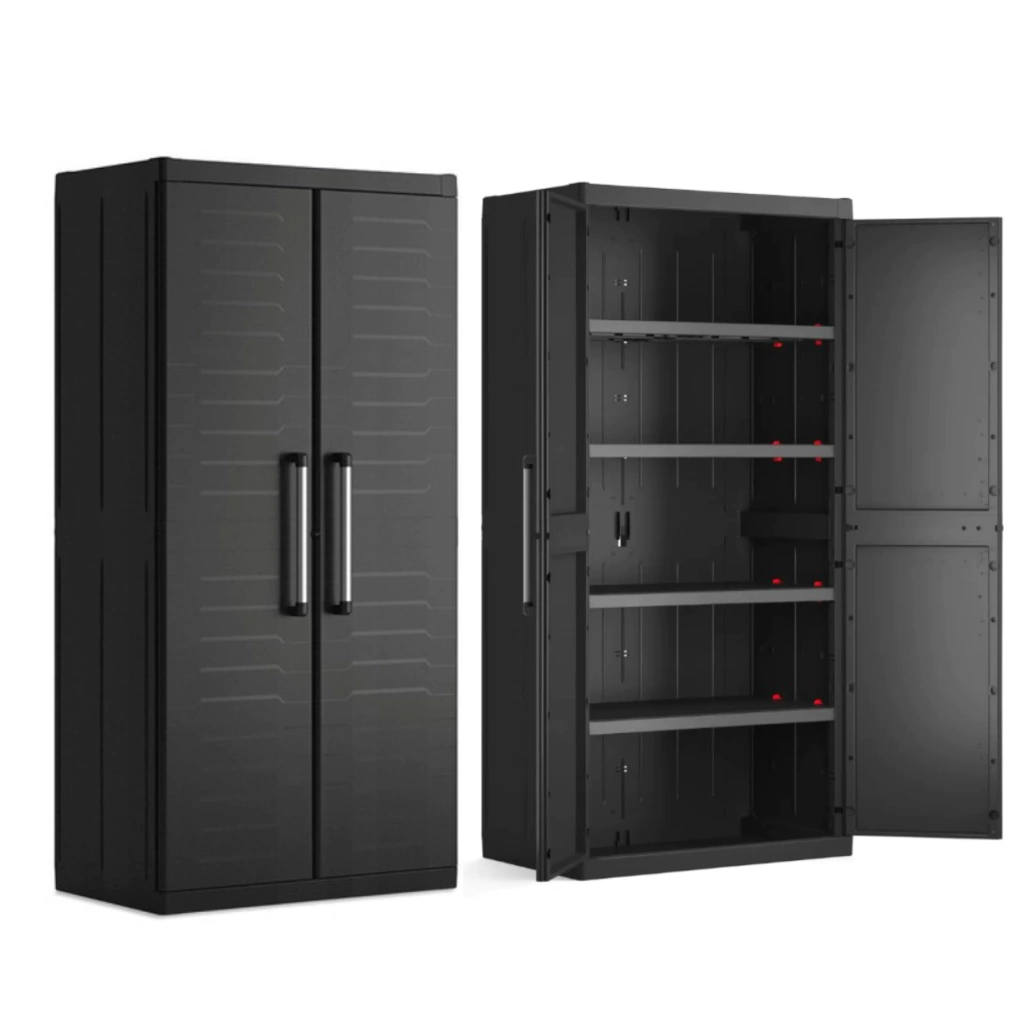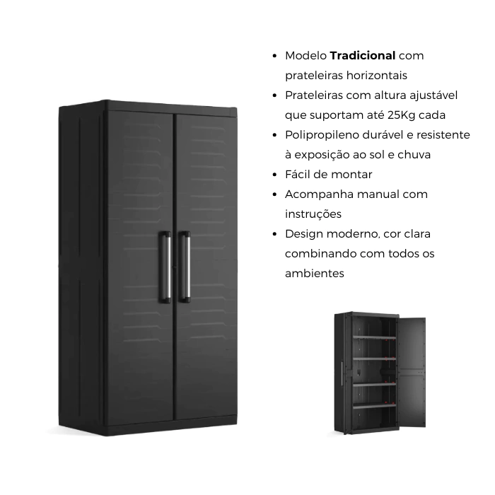 Este armário Detroit XL modelo tradicional com prateleiras horizontais, além de multiuso é perfeito para manter tudo arrumado e no lugar, seja na sua casa, garagem ou oficina. O organizador combina perfeitamente com todos os outros armários da coleção Detroit, inclusive com a linha Slim, fazendo um composê perfeito. Possui quatro prateleiras ajustáveis, cada uma com 25 Kg de capacidade. Permite-lhe planejar a sua solução de arrumação de utilidades de interior de uma forma inteligente, tornando o acesso fácil e eficiente sempre que precisar. Este armário de arrumação é feito de um plástico durável. As portas do armário são bloqueáveis, por isso os seus pertences permanecem seguros e organizados!