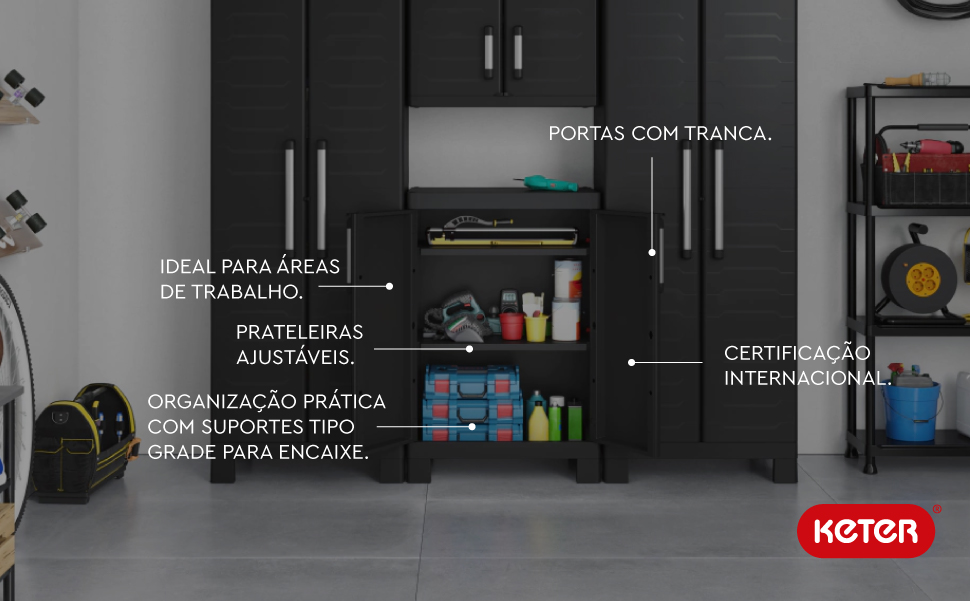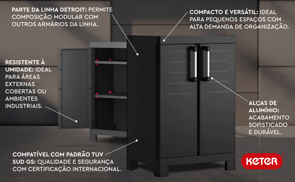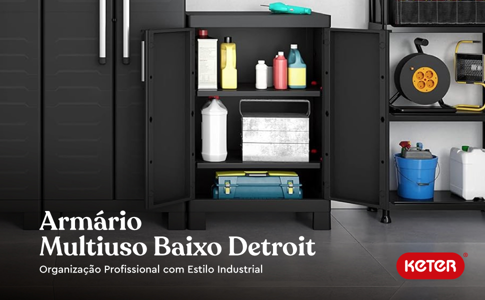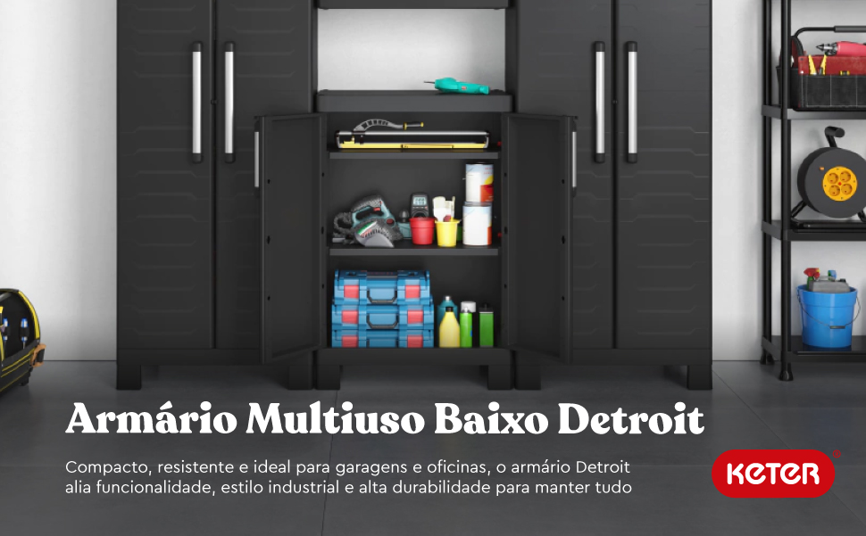 O Armário Baixo Detroit vem na cor preta, com portas estilo Garagem, portas trancáveis e duas prateleiras reguláveis, com grade para caixas Tribac, com capacidade para 15kg cada. O gabinete baixo vem completar a linha de armários Detroit, possibilitando uma perfeita de combinação de modelos e tamanhos com configuração internas diferentes que se ajustam a sua necessidade de organização.