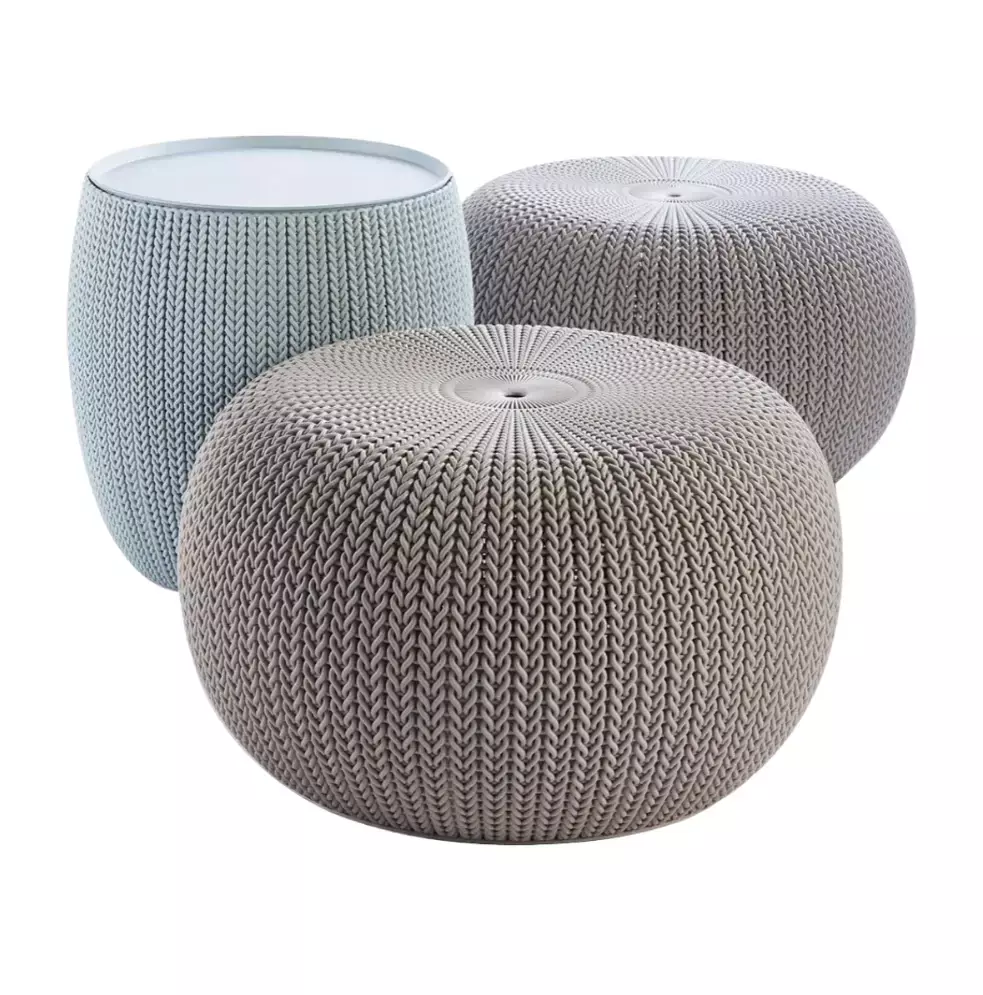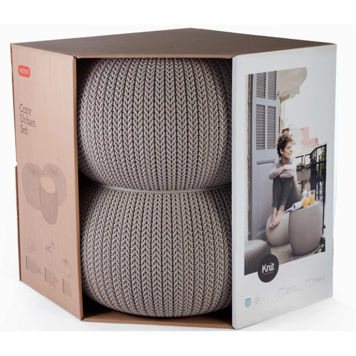 O Conjunto Cozy Seat da Keter é a escolha ideal para quem busca móveis práticos e elegantes. Composto por 2 pufes confortáveis e 1 mesa baú multifuncional, ele alia design moderno, textura sofisticada que imita tricô e a funcionalidade perfeita para uso interno ou externo.