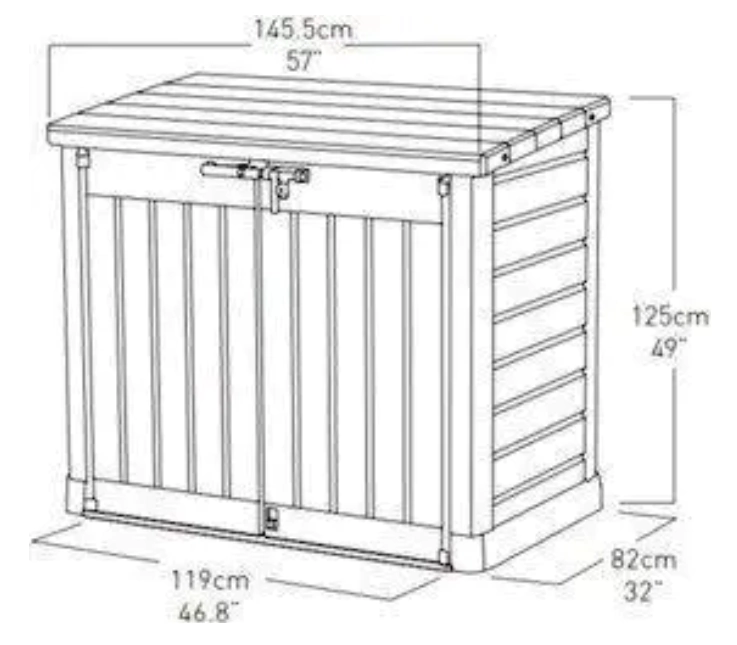 Este depósito de armazenamento Keter é uma versão ampliada do tradicional Store It Out com muito mais espaço interno para você usar na armazenagem de seus itens domésticos. Um móvel inteligente para disfarçar lixeiras, guardar com segurança equipamentos de jardinagem, móveis de jardim, churrasqueira, biblicletas e outros objetos de grande porte, em sua casa ou na garagem do condomínio.