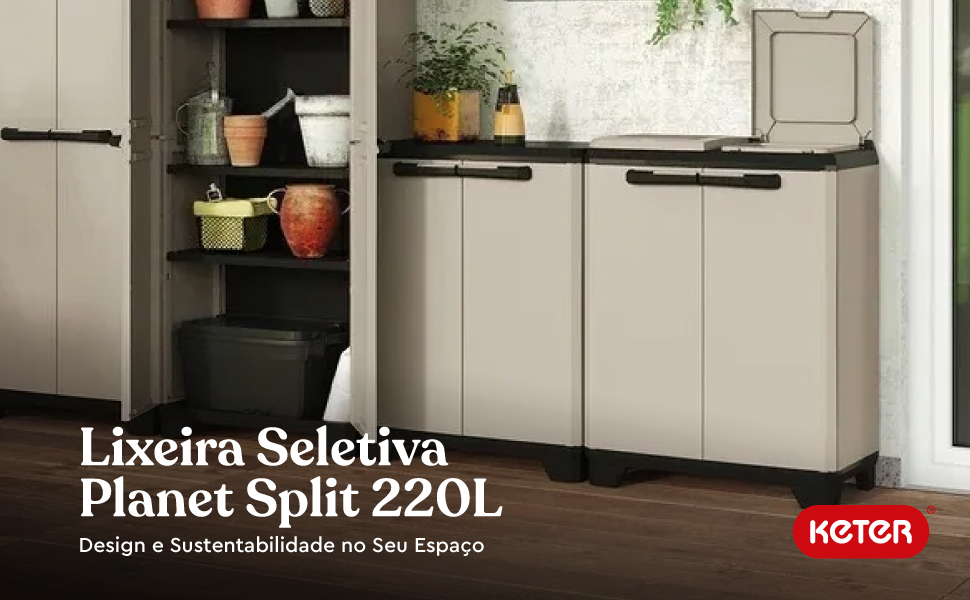 O armário Planet de reciclagem de resíduos é feito com mais de 80% de plástico reciclado, tem um design clean e moderno e torna o respeito ao meio ambiente uma ação fácil e bem mais prática. Este modelo exclusivo complementa a linha de armários planet, mantendo o design e a estética da linha.
