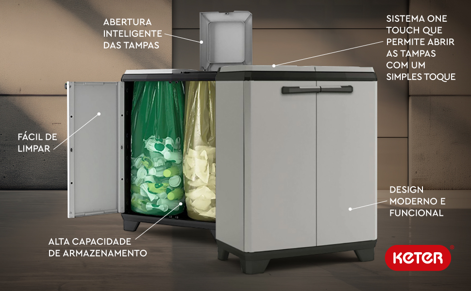 Com tampas de abertura de um toque, pés ajustáveis e alças de toque suave, este sistema de reciclagem é fácil de montar e fácil de usar. Capacidade para 2 sacos de reciclagem (110 L cada) não estão incluídos no kit do produto.