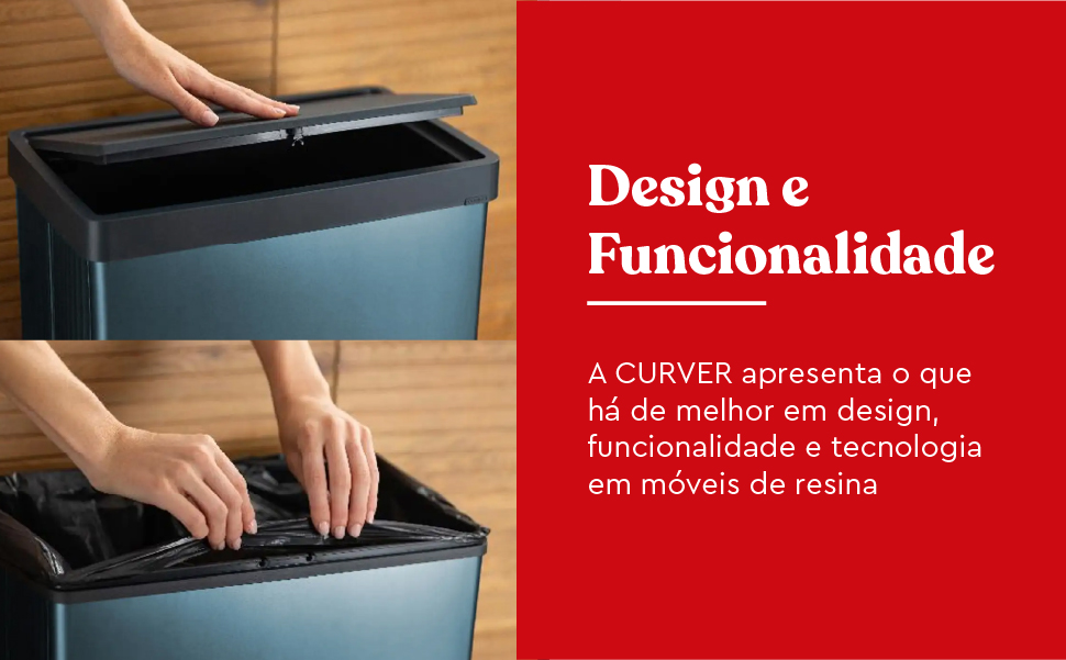 - Estrutura com tampa envolvente: esconde os sacos de lixo e mantém o visual limpo