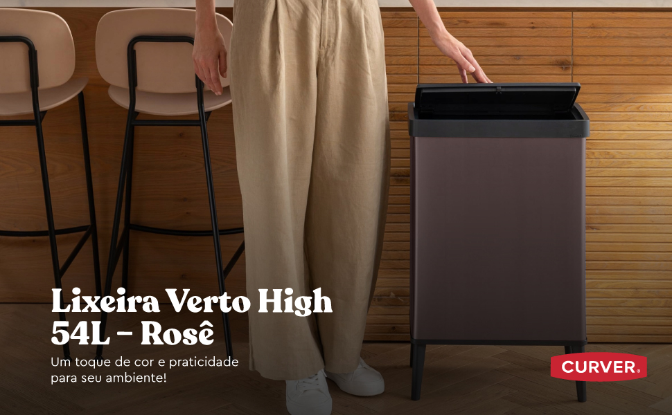 A Lixeira Verto 54L na cor Rosê traz um toque de charme e elegância a qualquer ambiente, sem abrir mão da praticidade e do compromisso com a sustentabilidade. Com acabamento 360°, ela pode ser posicionada em qualquer canto com harmonia estética, tornando-se um item de decoração funcional.