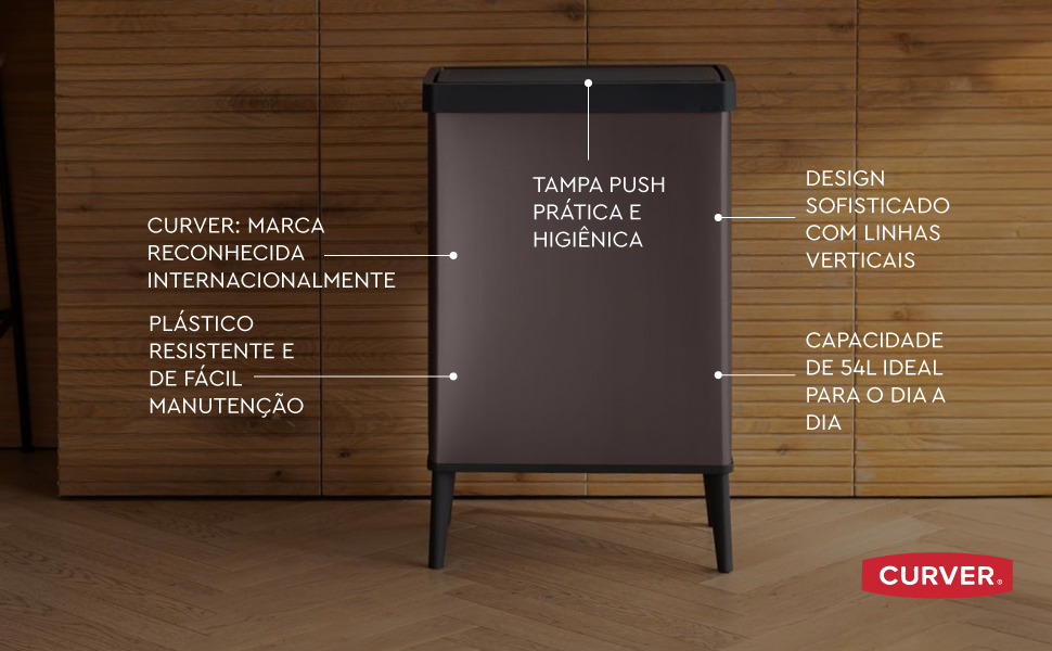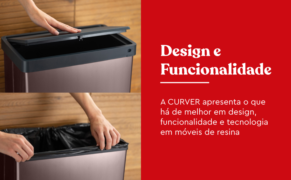 O sistema de abertura por toque (touch) garante uma experiência higiênica, silenciosa e fácil no uso diário. Sua estrutura foi projetada para esconder as bordas dos sacos, mantendo o visual sempre limpo e organizado. Além disso, permite o uso de 1 ou 2 sacos para facilitar a coleta seletiva.